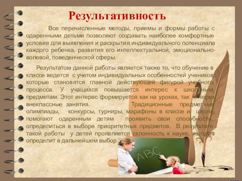 "среднего" ученика, повышенный интерес к одаренным, талантливым детям, раскрытие и развитие внутреннего потенциала, способностей каждого ребенка в процессе образования.