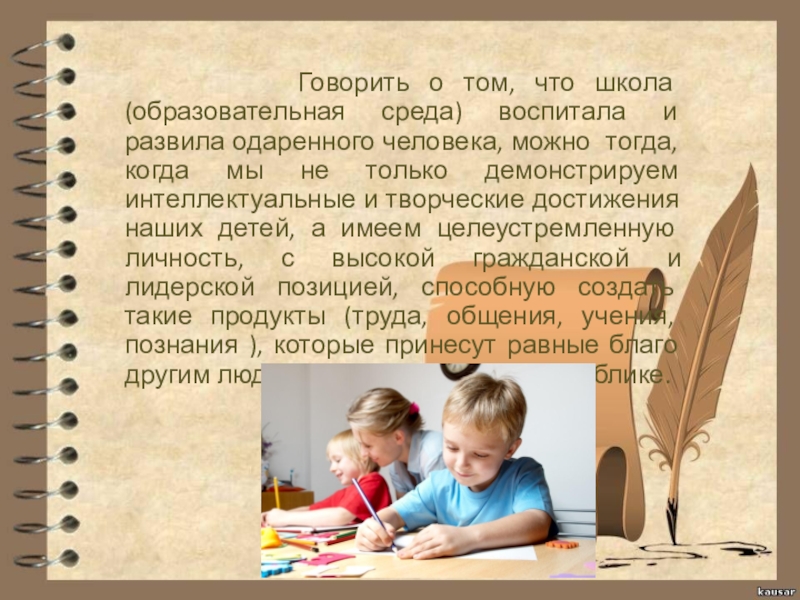 воспитала и развила одаренного человека, можно тогда, когда мы не только демонстрируем интеллектуальные и творческие достижения наших детей, а имеем целеустремленную личность, с высокой гражданской и лидерской позицией, способную создать такие продукты (труда, общения, учения, познания ), которые принесут равные благо другим людям, обществу, своей республике.