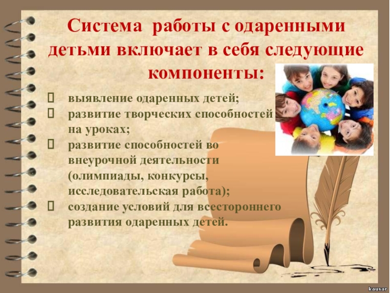 Слайд 6Система работы с одаренными детьми включает в себя следующие компоненты:
