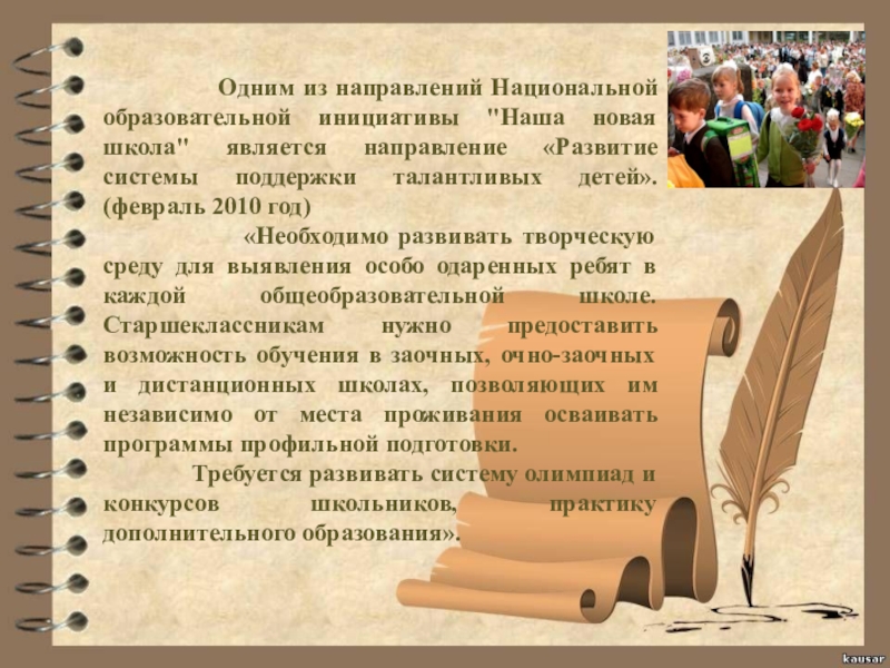 образовательной инициативы "Наша новая школа" является направление «Развитие системы поддержки талантливых детей». (февраль 2010 год)