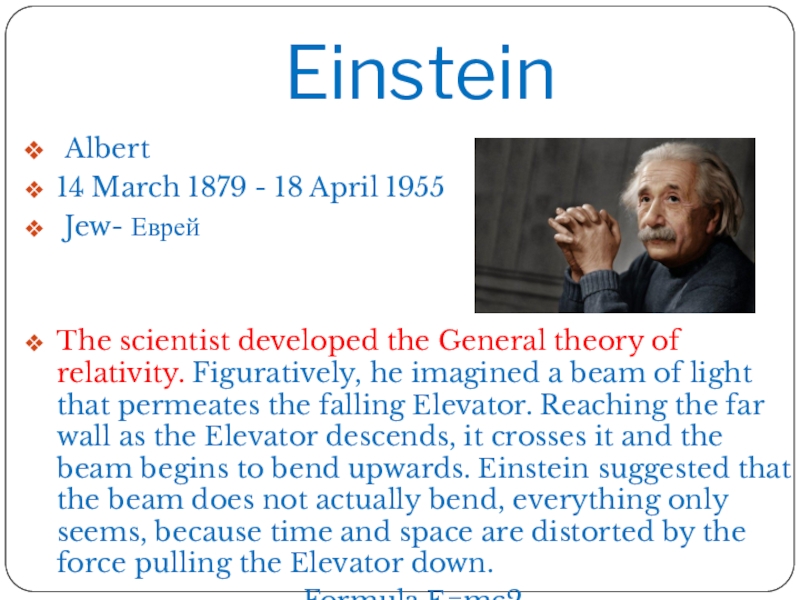 developed the General theory of relativity. Figuratively, he imagined a beam of light that permeates the falling Elevator. Reaching the far wall as the Elevator descends, it crosses it and the beam begins to bend upwards. Einstein suggested that the beam does not actually bend, everything only seems, because time and space are distorted by the force pulling the Elevator down.