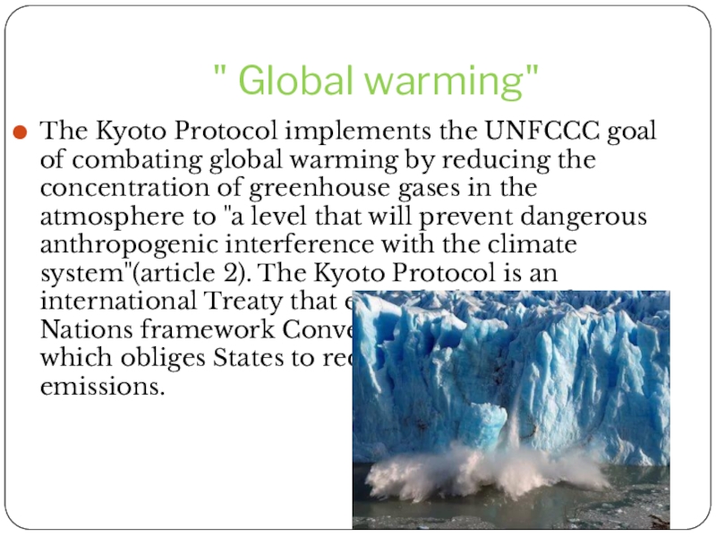 global warming by reducing the concentration of greenhouse gases in the atmosphere to "a level that will prevent dangerous anthropogenic interference with the climate system"(article 2). The Kyoto Protocol is an international Treaty that extends the United Nations framework Convention on climate change, which obliges States to reduce greenhouse gas emissions.