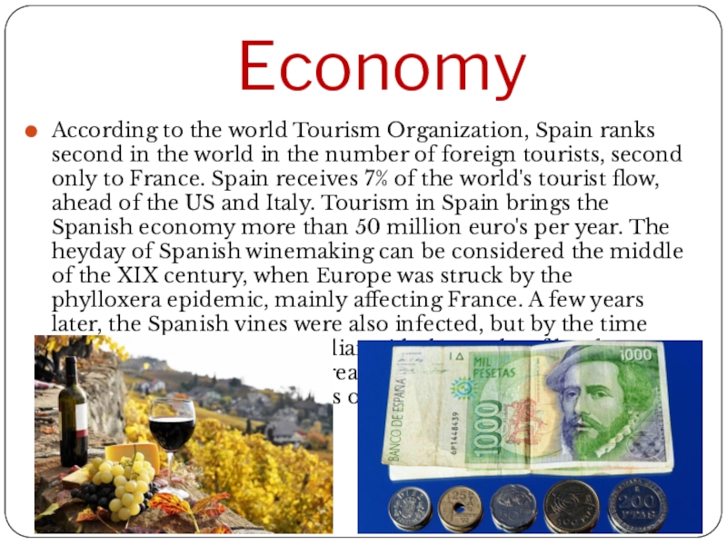 world in the number of foreign tourists, second only to France. Spain receives 7% of the world's tourist flow, ahead of the US and Italy. Tourism in Spain brings the Spanish economy more than 50 million euro's per year. The heyday of Spanish winemaking can be considered the middle of the XIX century, when Europe was struck by the phylloxera epidemic, mainly affecting France. A few years later, the Spanish vines were also infected, but by the time the world has become familiar with the works of local winemakers, besides has already been found salvation: grafting to regional varieties of American vines that are immune to the disease.