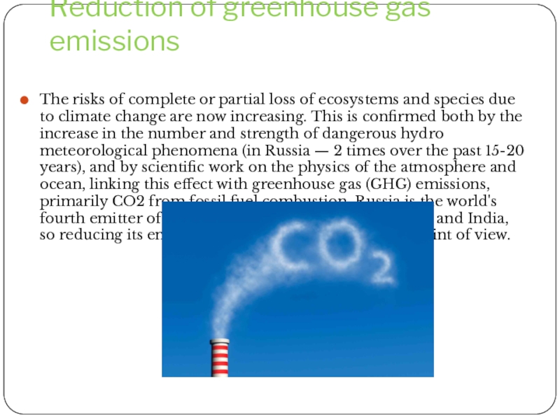 of ecosystems and species due to climate change are now increasing. This is confirmed both by the increase in the number and strength of dangerous hydro meteorological phenomena (in Russia — 2 times over the past 15-20 years), and by scientific work on the physics of the atmosphere and ocean, linking this effect with greenhouse gas (GHG) emissions, primarily CO2 from fossil fuel combustion. Russia is the world's fourth emitter of greenhouse gases, after China, the US and India, so reducing its emissions is important from a global point of view.