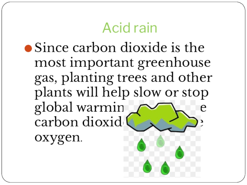 trees and other plants will help slow or stop global warming. Plants take carbon dioxide and release oxygen.