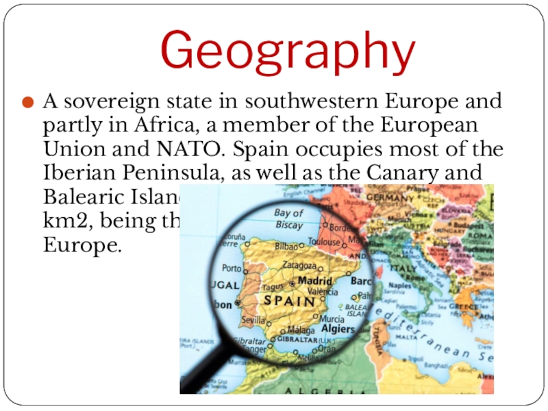 member of the European Union and NATO. Spain occupies most of the Iberian Peninsula, as well as the Canary and Balearic Islands, has a total area of 504782 km2, being the fourth largest country in Europe.