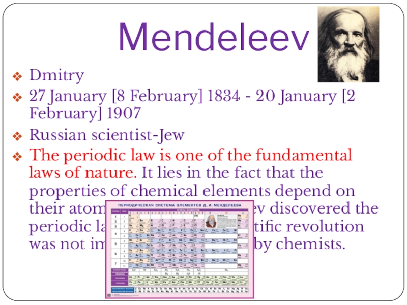 The periodic law is one of the fundamental laws of nature. It lies in the fact that the properties of chemical elements depend on their atomic weight. Mendeleev discovered the periodic law in 1869. His scientific revolution was not immediately realized by chemists.