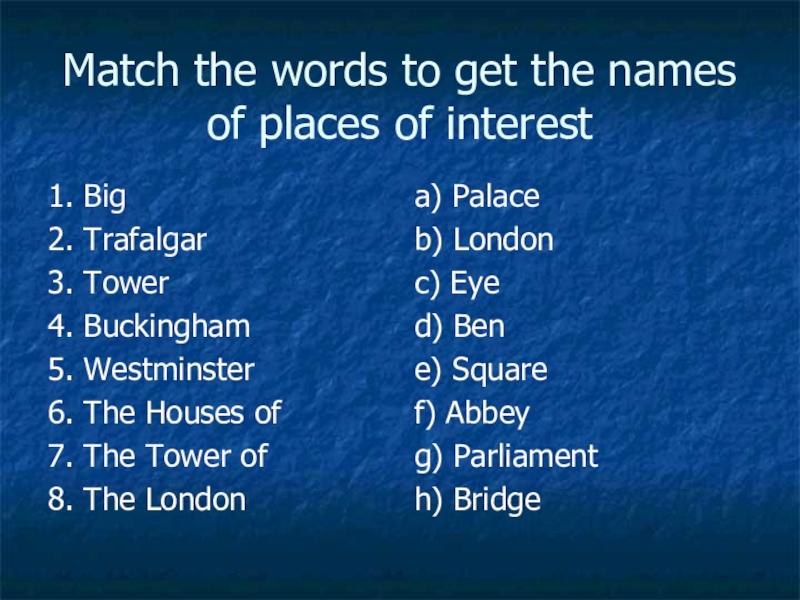 h) home of the British Parliament.