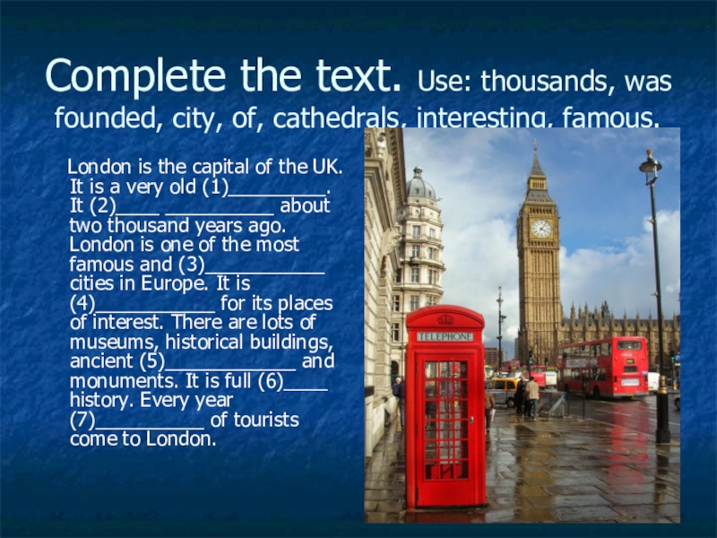 London is the capital of the UK. It is a very old (1)_________. It (2)____ __________ about two thousand years ago. London is one of the most famous and (3)___________ cities in Europe. It is (4)___________ for its places of interest. There are lots of museums, historical buildings, ancient (5)____________ and monuments. It is full (6)____ history. Every year (7)__________ of tourists come to London.
