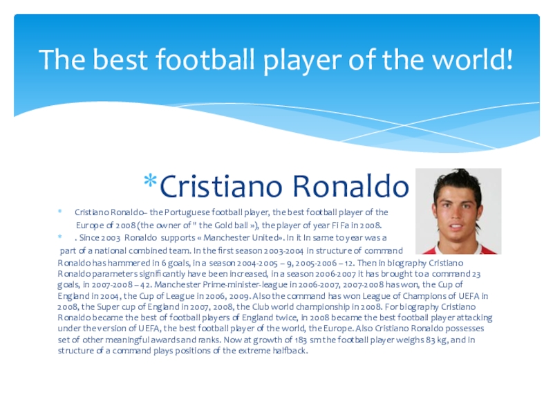 Ronaldo has hammered in 6 goals, in a season 2004-2005 – 9, 2005-2006 – 12. Then in biography Cristiano Ronaldo parameters significantly have been increased, in a season 2006-2007 it has brought to a command 23 goals, in 2007-2008 – 42. Manchester Prime-minister-league in 2006-2007, 2007-2008 has won, the Cup of England in 2004, the Cup of League in 2006, 2009. Also the command has won League of Champions of UEFA in 2008, the Super cup of England in 2007, 2008, the Club world championship in 2008. For biography Cristiano Ronaldo became the best of football players of England twice, in 2008 became the best football player attacking under the version of UEFA, the best football player of the world, the Europe. Also Cristiano Ronaldo possesses set of other meaningful awards and ranks. Now at growth of 183 sm the football player weighs 83 kg, and in structure of a command plays positions of the extreme halfback.