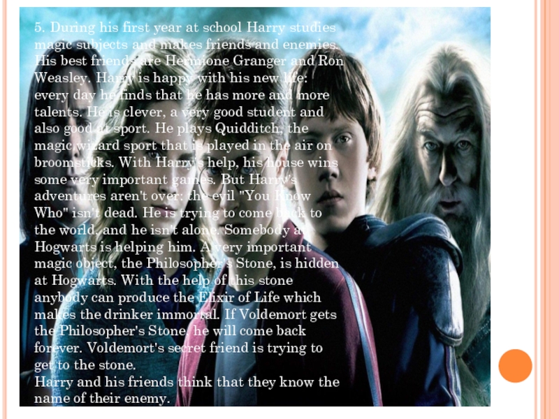 and makes friends and enemies. His best friends are Hermione Granger and Ron Weasley. Harry is happy with his new life: every day he finds that he has more and more talents. He is clever, a very good student and also good at sport. He plays Quidditch, the magic wizard sport that is played in the air on broomsticks. With Harry's help, his house wins some very important games. But Harry's adventures aren't over: the evil "You Know Who" isn't dead. He is trying to come back to the world, and he isn't alone. Somebody at Hogwarts is helping him. A very important magic object, the Philosopher's Stone, is hidden at Hogwarts. With the help of this stone anybody can produce the Elixir of Life which makes the drinker immortal. If Voldemort gets the Philosopher's Stone, he will come back forever. Voldemort's secret friend is trying to get to the stone.