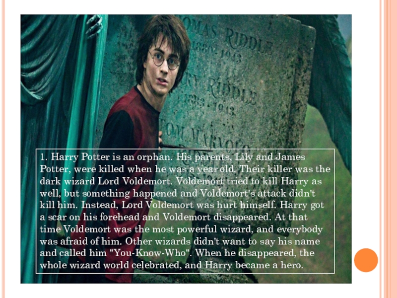 Слайд 31. Harry Potter is an orphan. His parents, Lily and James