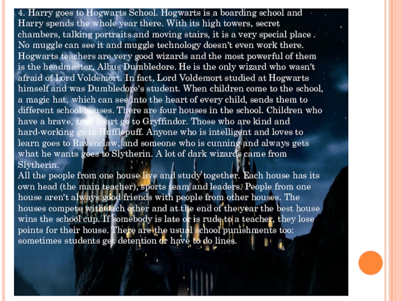 and Harry spends the whole year there. With its high towers, secret chambers, talking portraits and moving stairs, it is a very special place . No muggle can see it and muggle technology doesn't even work there. Hogwarts teachers are very good wizards and the most powerful of them is the headmaster, Albus Dumbledore. He is the only wizard who wasn't afraid of Lord Voldemort. In fact, Lord Voldemort studied at Hogwarts himself and was Dumbledore's student. When children come to the school, a magic hat, which can see into the heart of every child, sends them to different school houses. There are four houses in the school. Children who have a brave, true heart go to Gryffindor. Those who are kind and hard-working go to Hufflepuff. Anyone who is intelligent and loves to learn goes to Ravenclaw, and someone who is cunning and always gets what he wants goes to Slytherin. A lot of dark wizards came from Slytherin.