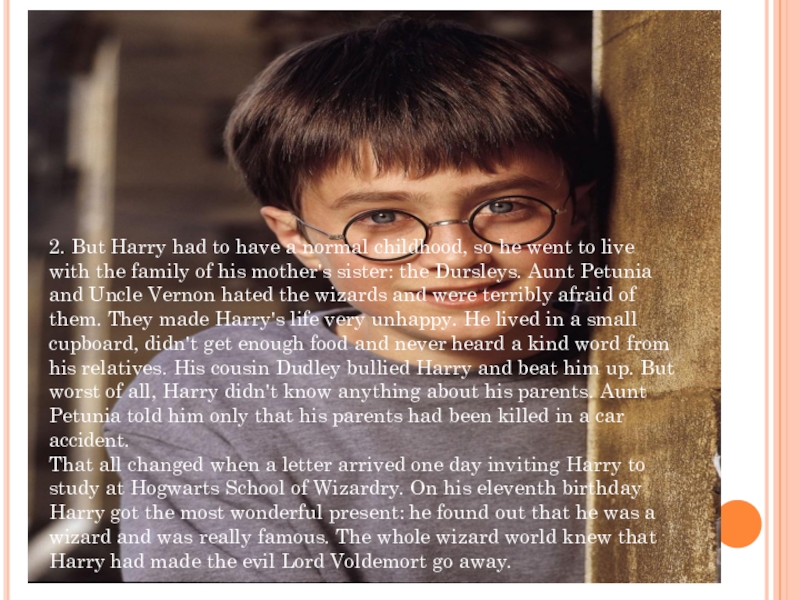 went to live with the family of his mother's sister: the Dursleys. Aunt Petunia and Uncle Vernon hated the wizards and were terribly afraid of them. They made Harry's life very unhappy. He lived in a small cupboard, didn't get enough food and never heard a kind word from his relatives. His cousin Dudley bullied Harry and beat him up. But worst of all, Harry didn't know anything about his parents. Aunt Petunia told him only that his parents had been killed in a car accident.