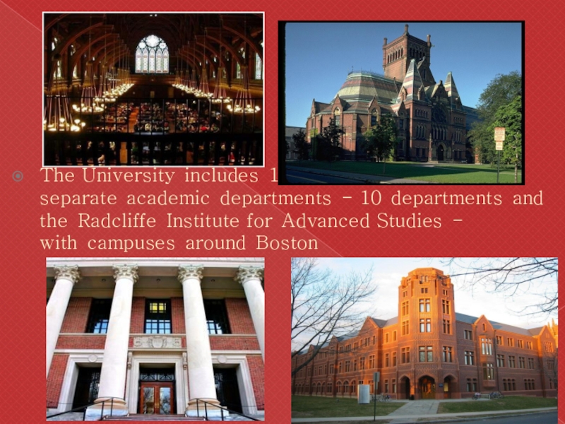 The University includes 11 separate academic departments - 10 departments and the Radcliffe Institute for Advanced Studies - with campuses around Boston