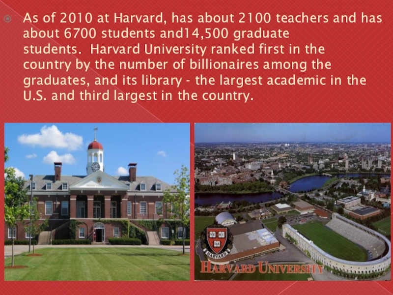 Слайд 5As of 2010 at Harvard, has about 2100 teachers and has about 6700 students and14,500 graduate students.  Harvard University ranked first in the
