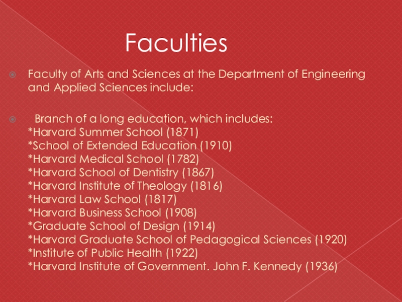 Branch of a long education, which includes: *Harvard Summer School (1871) *School of Extended Education (1910) *Harvard Medical School (1782) *Harvard School of Dentistry (1867) *Harvard Institute of Theology (1816) *Harvard Law School (1817) *Harvard Business School (1908) *Graduate School of Design (1914) *Harvard Graduate School of Pedagogical Sciences (1920) *Institute of Public Health (1922) *Harvard Institute of Government. John F. Kennedy (1936)