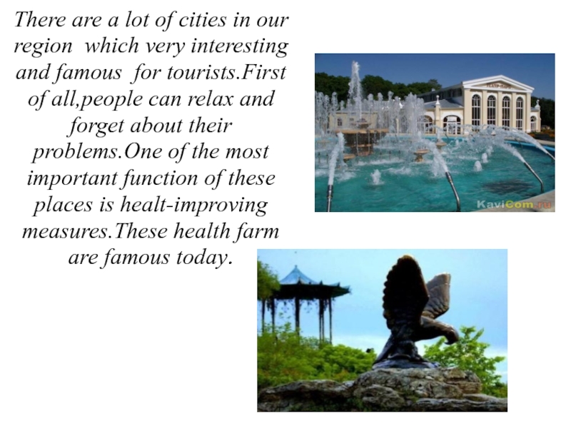 There are a lot of cities in our region which very interesting and famous for tourists.First of all,people can relax and forget about their problems.One of the most important function of these places is healt-improving measures.These