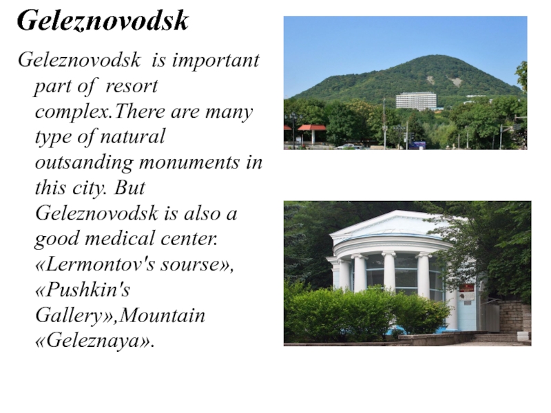 of natural outsanding monuments in this city. But Geleznovodsk is also a good medical center. «Lermontov's sourse», «Pushkin's Gallery»,Mountain «Geleznaya».