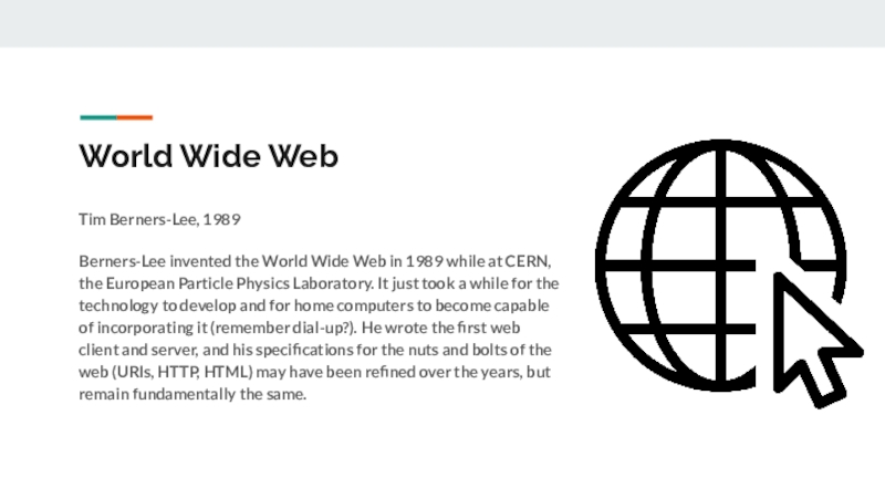 1989 while at CERN, the European Particle Physics Laboratory. It just took a while for the technology to develop and for home computers to become capable of incorporating it (remember dial-up?). He wrote the first web client and server, and his specifications for the nuts and bolts of the web (URIs, HTTP, HTML) may have been refined over the years, but remain fundamentally the same.