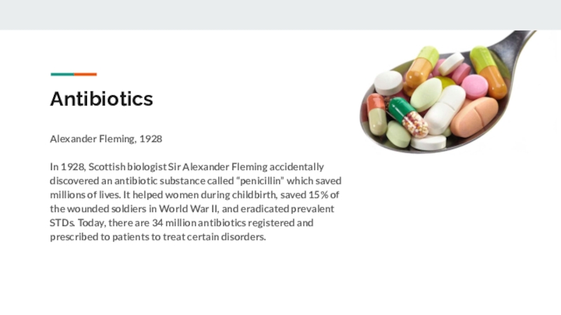 an antibiotic substance called “penicillin” which saved millions of lives. It helped women during childbirth, saved 15% of the wounded soldiers in World War II, and eradicated prevalent STDs. Today, there are 34 million antibiotics registered and prescribed to patients to treat certain disorders.