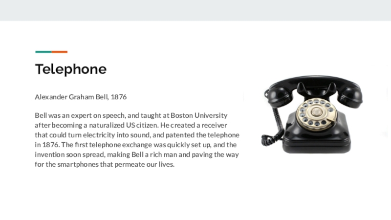 at Boston University after becoming a naturalized US citizen. He created a receiver that could turn electricity into sound, and patented the telephone in 1876. The first telephone exchange was quickly set up, and the invention soon spread, making Bell a rich man and paving the way for the smartphones that permeate our lives.
