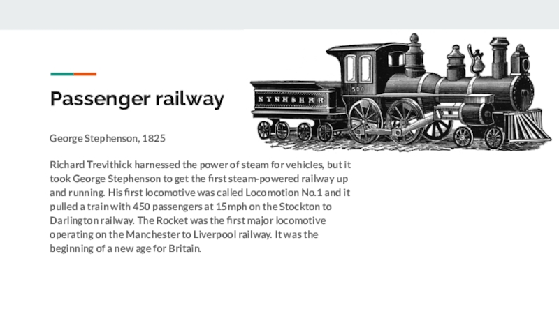 vehicles, but it took George Stephenson to get the first steam-powered railway up and running. His first locomotive was called Locomotion No.1 and it pulled a train with 450 passengers at 15mph on the Stockton to Darlington railway. The Rocket was the first major locomotive operating on the Manchester to Liverpool railway. It was the beginning of a new age for Britain.