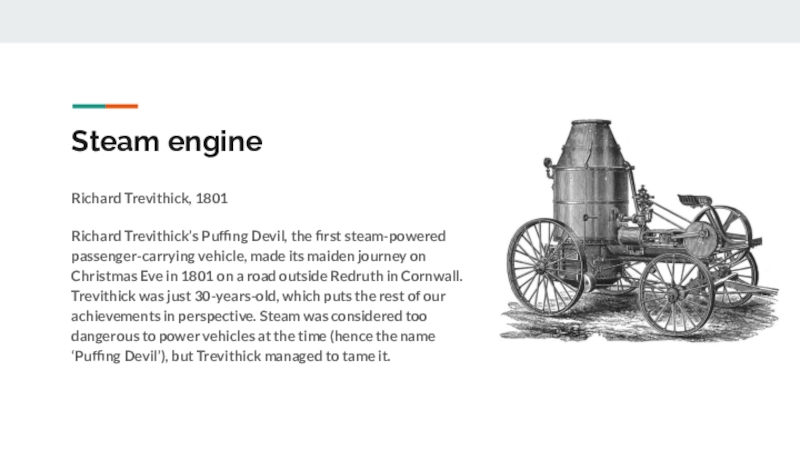 vehicle, made its maiden journey on Christmas Eve in 1801 on a road outside Redruth in Cornwall. Trevithick was just 30-years-old, which puts the rest of our achievements in perspective. Steam was considered too dangerous to power vehicles at the time (hence the name ‘Puffing Devil’), but Trevithick managed to tame it.
