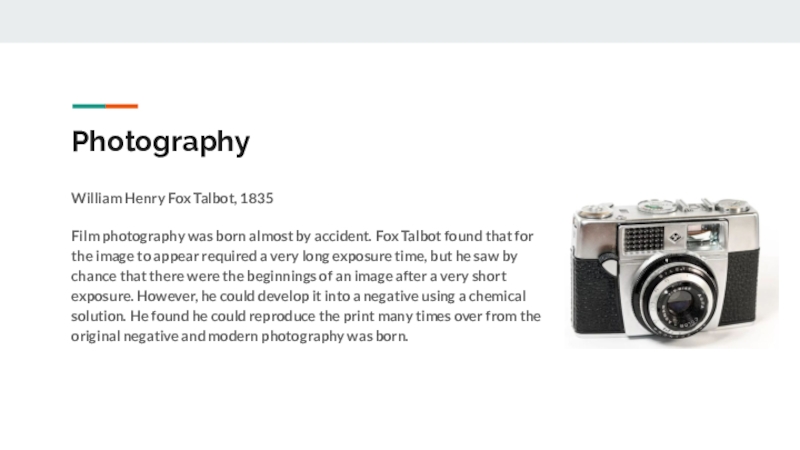 Fox Talbot found that for the image to appear required a very long exposure time, but he saw by chance that there were the beginnings of an image after a very short exposure. However, he could develop it into a negative using a chemical solution. He found he could reproduce the print many times over from the original negative and modern photography was born.