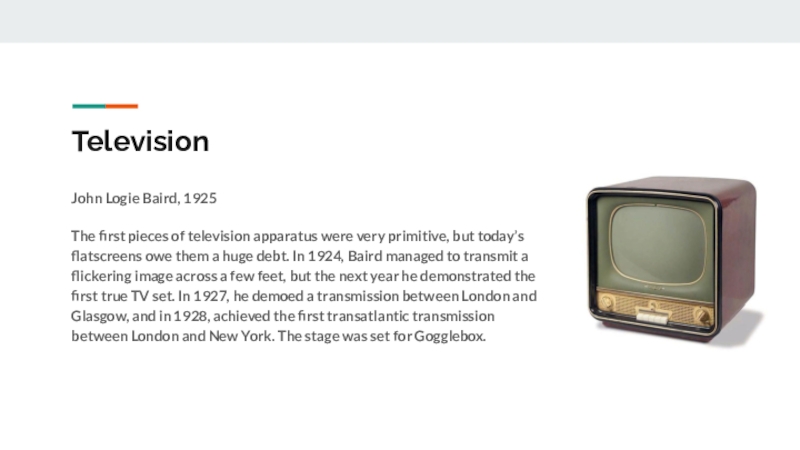 primitive, but today’s flatscreens owe them a huge debt. In 1924, Baird managed to transmit a flickering image across a few feet, but the next year he demonstrated the first true TV set. In 1927, he demoed a transmission between London and Glasgow, and in 1928, achieved the first transatlantic transmission between London and New York. The stage was set for Gogglebox.