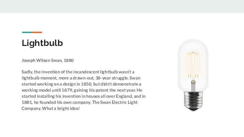 a lightbulb moment, more a drawn-out, 30-year struggle. Swan started working on a design in 1850, but didn’t demonstrate a working model until 1879, gaining his patent the next year. He started installing his invention in houses all over England, and in 1881, he founded his own company, The Swan Electric Light Company. What a bright idea!