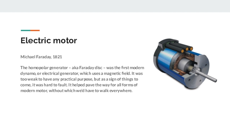 was the first modern dynamo, or electrical generator, which uses a magnetic field. It was too weak to have any practical purpose, but as a sign of things to come, it was hard to fault. It helped pave the way for all forms of modern motor, without which we’d have to walk everywhere.