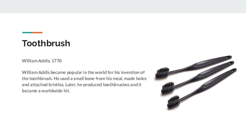 invention of the toothbrush. He used a small bone from his meal, made holes and attached bristles. Later, he produced toothbrushes and it became a worldwide hit.