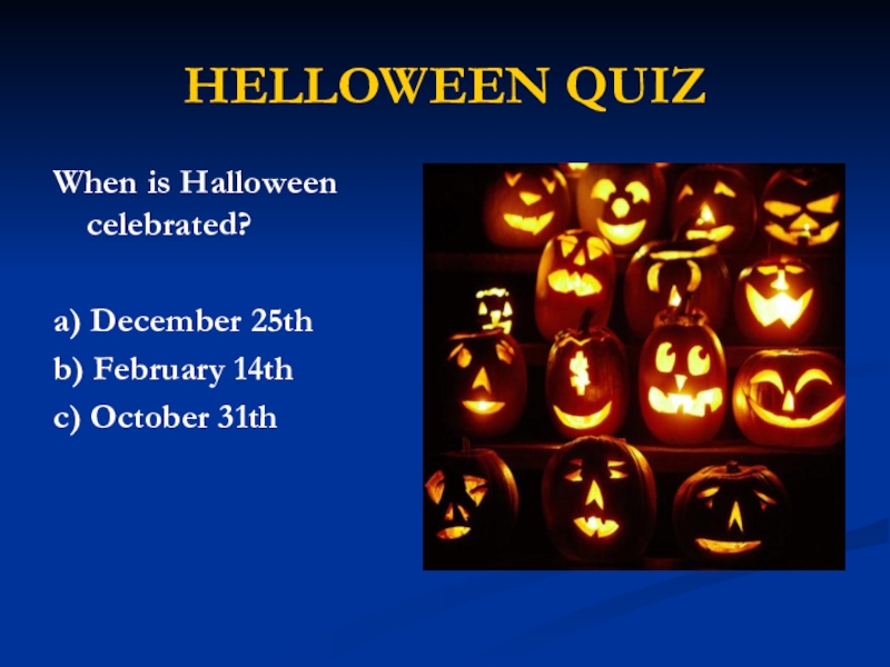 HELLOWEEN QUIZWhen is Halloween celebrated?a) December 25thb) February 14thc) October 31th