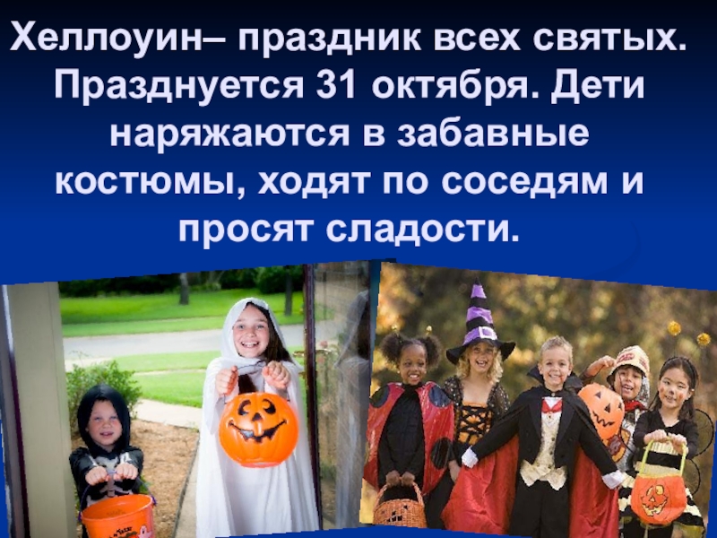 Хеллоуин– праздник всех святых. Празднуется 31 октября. Дети наряжаются в забавные костюмы, ходят по соседям и просят