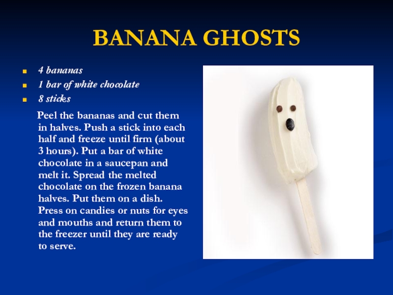 the bananas and cut them in halves. Push a stick into each half and freeze until firm (about 3 hours). Put a bar of white chocolate in a saucepan and melt it. Spread the melted chocolate on the frozen banana halves. Put them on a dish. Press on candies or nuts for eyes and mouths and return them to the freezer until they are ready to serve.