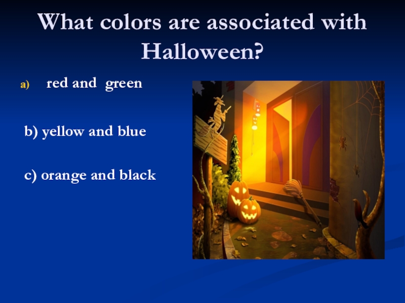 What colors are associated with Halloween? red and green b) yellow and blue c) orange and black