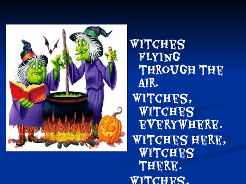 Witches flying through the air. Witches, witches everywhere. Witches here, witches there.Witches, witches everywhere.