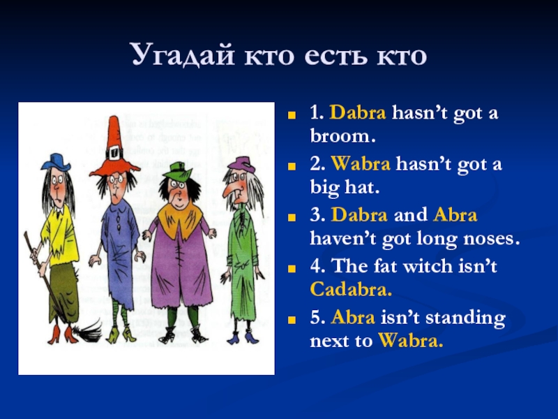 Угадай кто есть кто1. Dabra hasn’t got a broom.2. Wabra hasn’t got a big hat.3. Dabra and