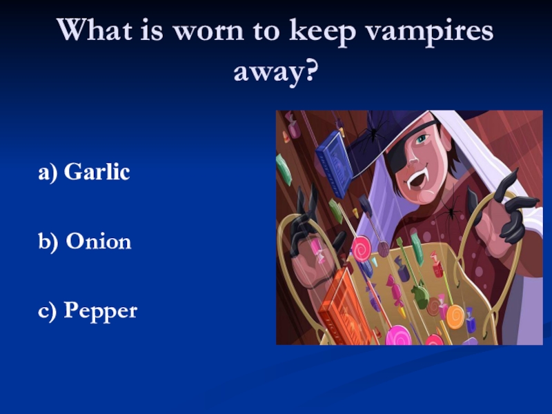 What is worn to keep vampires away? a) Garlicb) Onionc) Pepper