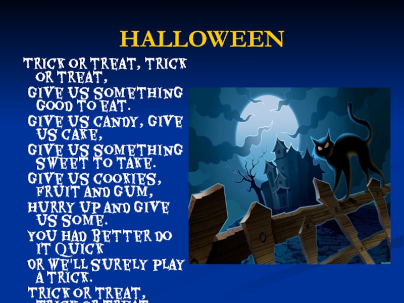 HALLOWEEN Trick or treat, trick or treat, Give us something good to eat. Give us candy, give