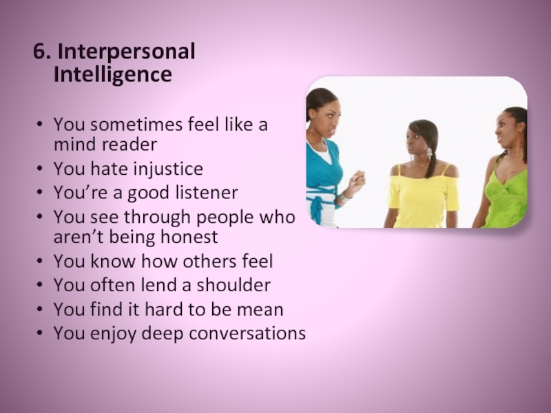 6. Interpersonal IntelligenceYou sometimes feel like a mind readerYou hate injusticeYou’re a good listenerYou see through people