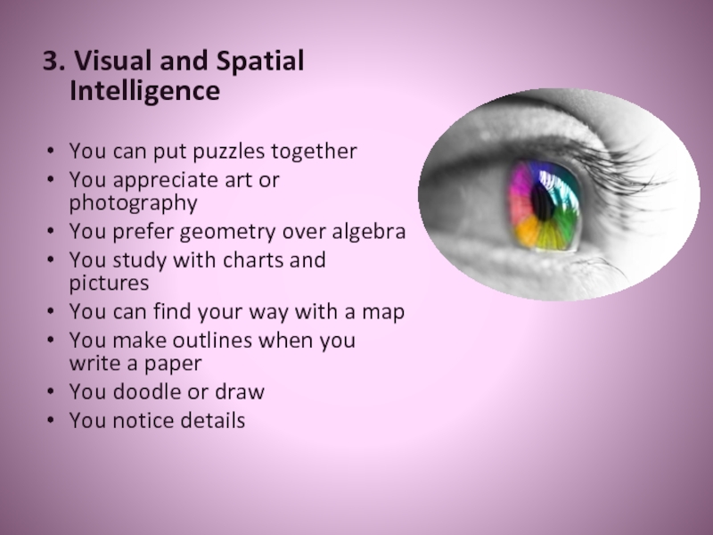 3. Visual and Spatial IntelligenceYou can put puzzles togetherYou appreciate art or photographyYou prefer geometry over algebraYou
