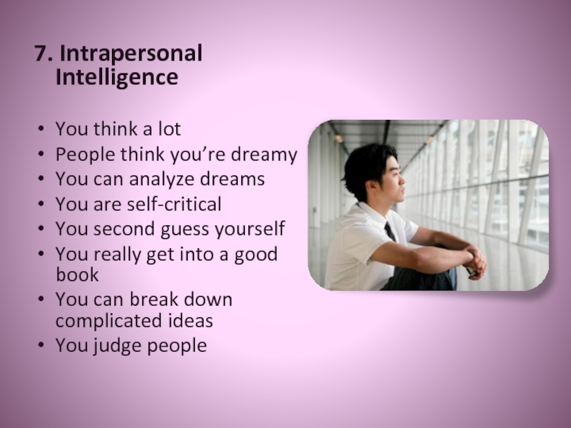 7. Intrapersonal IntelligenceYou think a lotPeople think you’re dreamyYou can analyze dreamsYou are self-criticalYou second guess yourselfYou