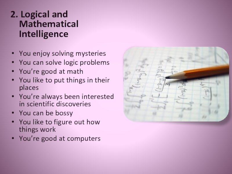2. Logical and Mathematical IntelligenceYou enjoy solving mysteriesYou can solve logic problemsYou’re good at mathYou like to