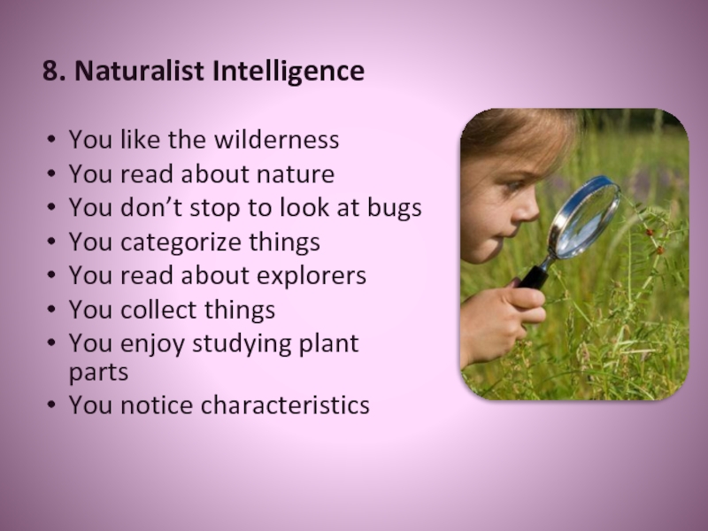 8. Naturalist IntelligenceYou like the wildernessYou read about natureYou don’t stop to look at bugsYou categorize thingsYou