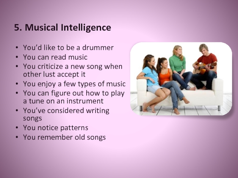5. Musical IntelligenceYou’d like to be a drummerYou can read musicYou criticize a new song when other
