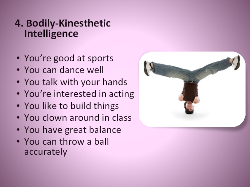 4. Bodily-Kinesthetic IntelligenceYou’re good at sportsYou can dance wellYou talk with your handsYou’re interested in actingYou like