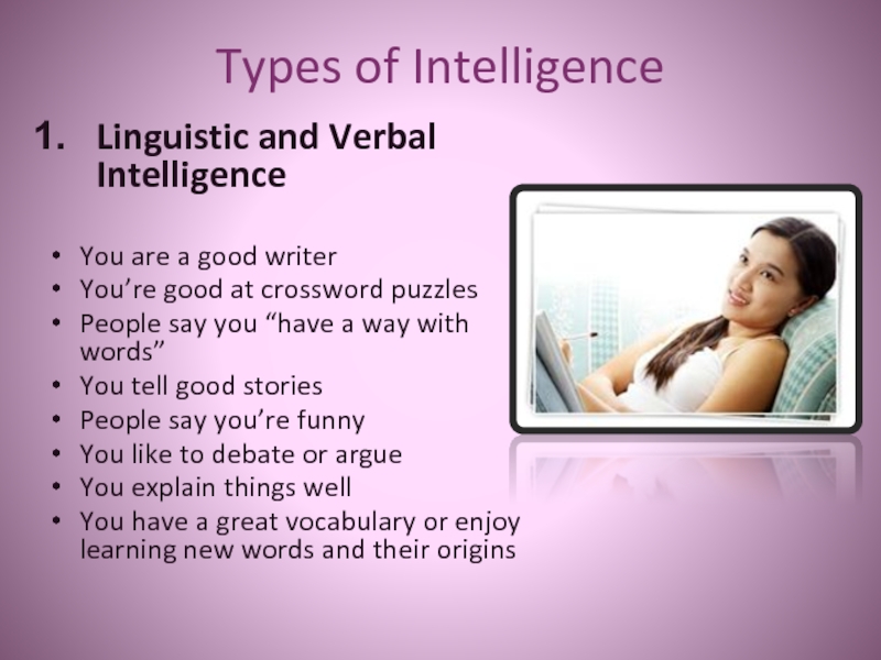 Types of IntelligenceLinguistic and Verbal IntelligenceYou are a good writerYou’re good at crossword puzzlesPeople say you “have
