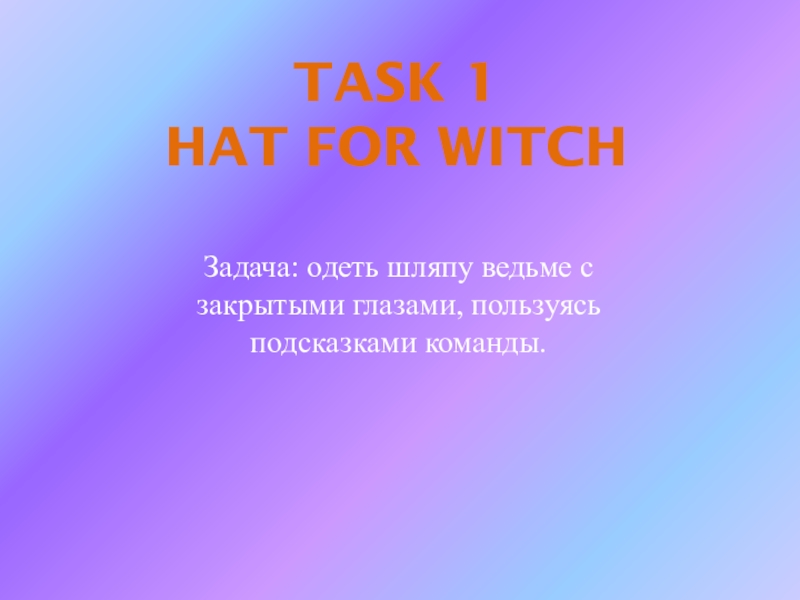 TASK 1 HAT FOR WITCHЗадача: одеть шляпу ведьме с закрытыми глазами, пользуясь подсказками команды.